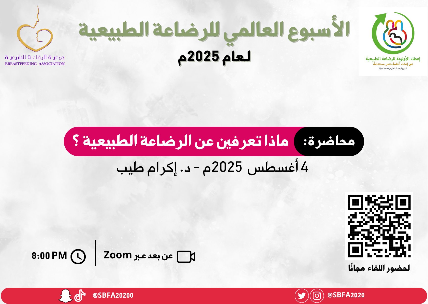 يسعدنا في جمعية الرضاعة الطبيعية أن نعلن عن بدء سلسلة المحاضرات التوعوية ضمن فعاليات هذا الأسبوع المميز