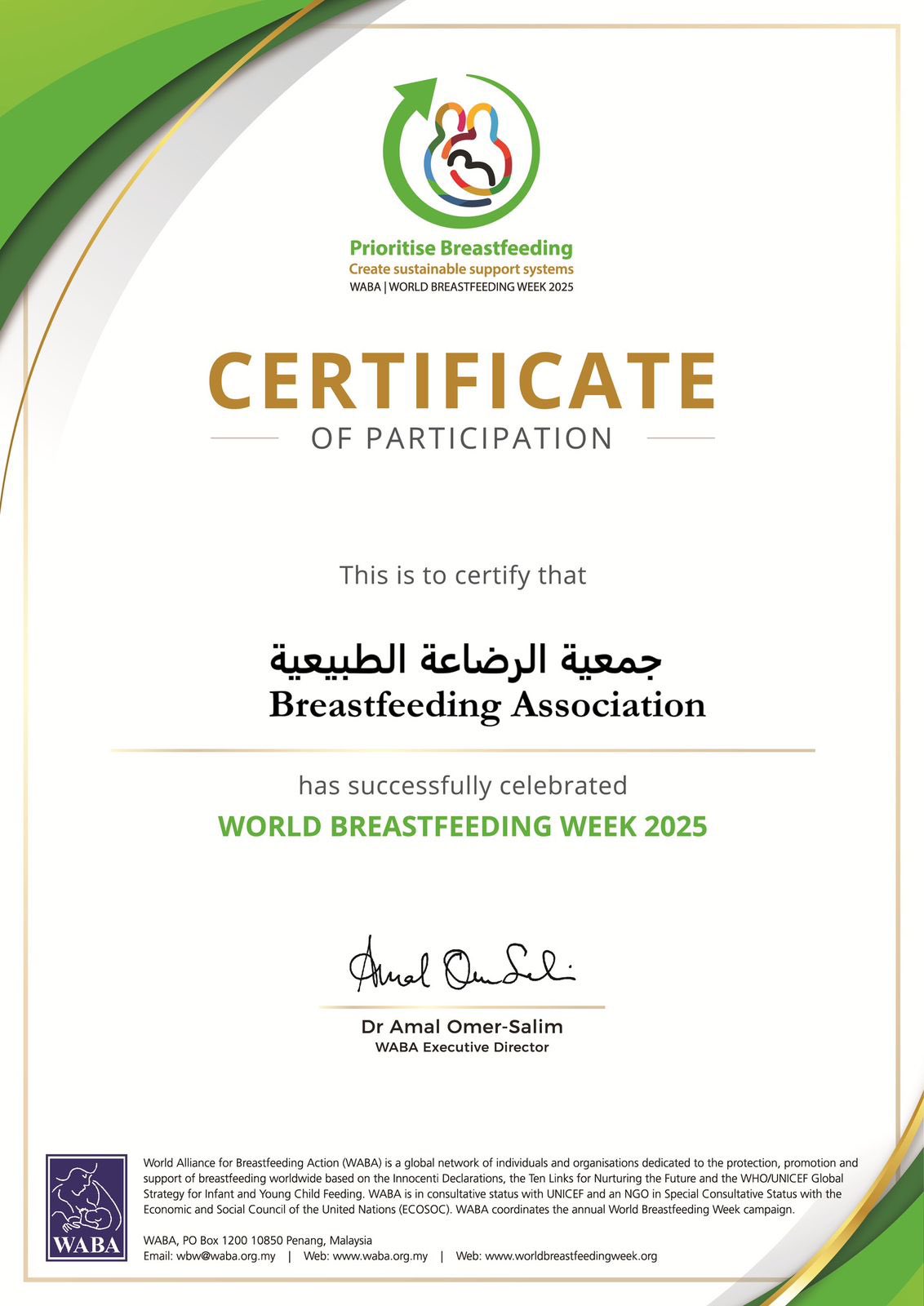 حصلت جمعية الرضاعة الطبيعية على شهادة WABA لعام 2025م، تقديراً لجهودها المستمرة في دعم وتشجيع الرضاعة الطبيعية، وتعزيز وعي المجتمع بأهميتها لصحة الأم والطفل. هذا الإنجاز هو ثمرة العطاء والعمل الجماعي، ونخطو به خطوة جديدة نحو مستقبل أكثر صحة وسعادة لأطفالنا وأسرنا