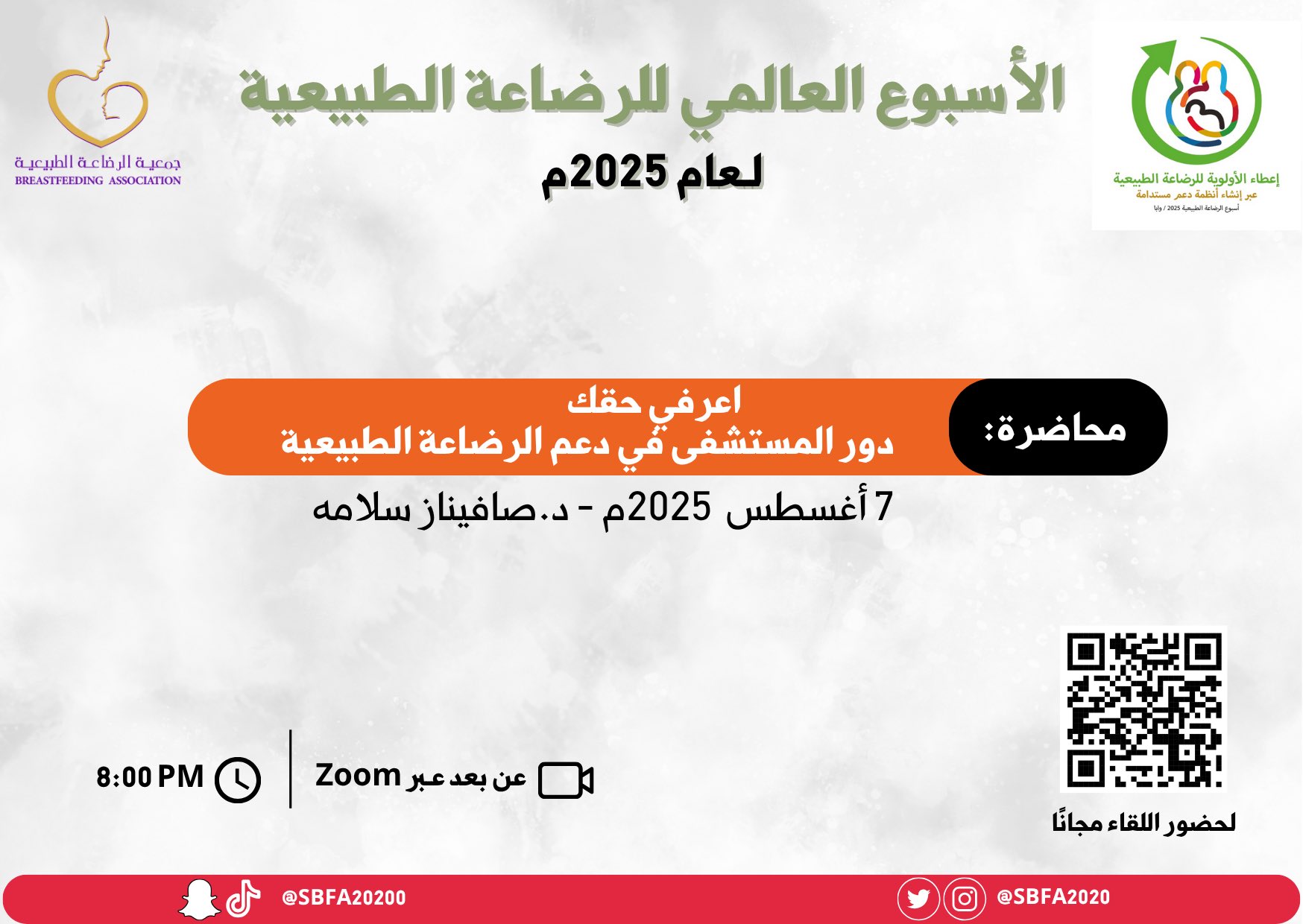 اليوم: الخميس 7 أغسطس عنوان المحاضرة: اعرفي حقك-دور المستشفى في دعم الرضاعة الطبيعية.