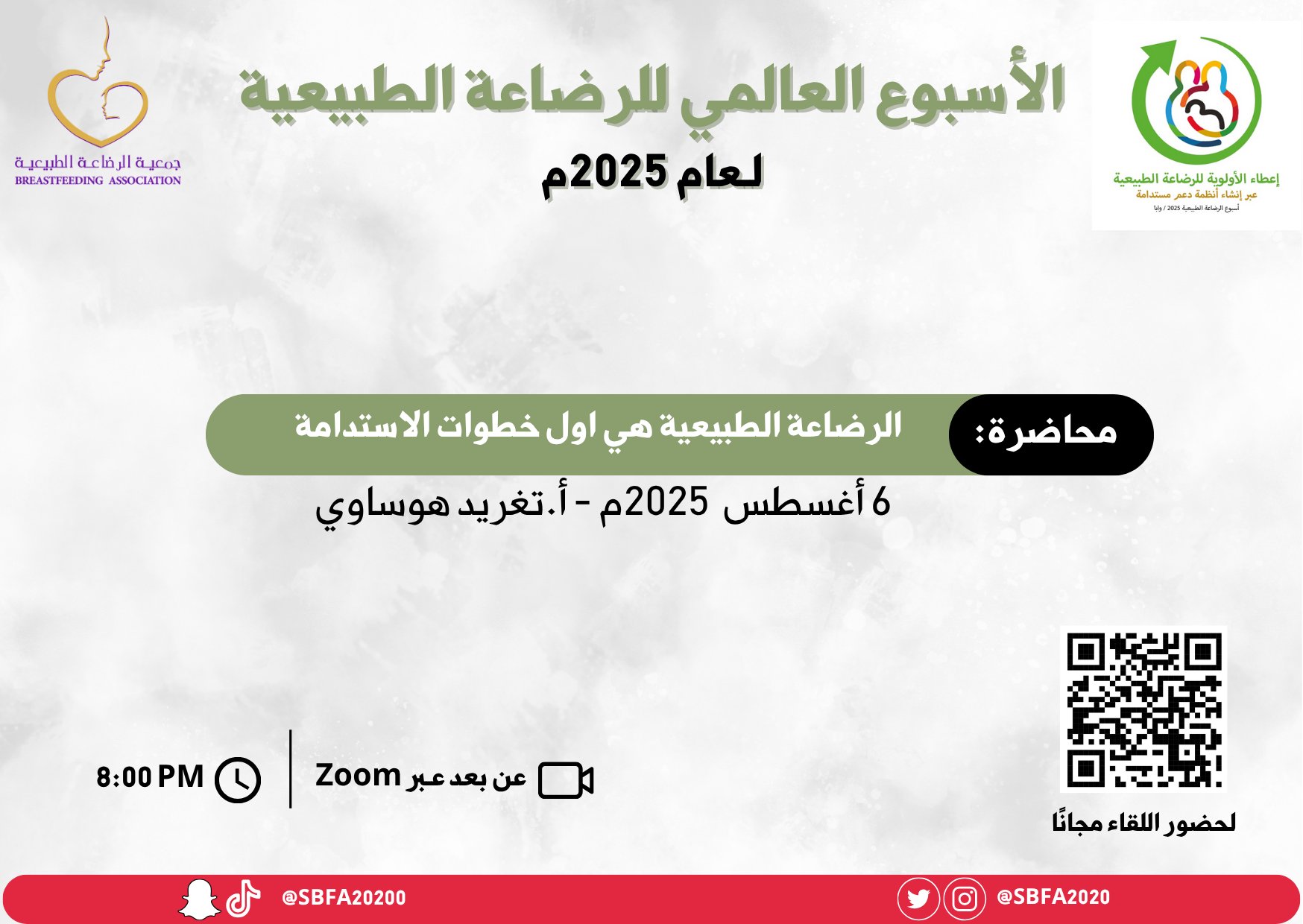 عنوان المحاضرة: الرضاعة الطبيعية هي أول خطوات الأستدامة. عبر منصة زووم لحضور المحاضرة: https://us02web.zoom.us/meeting/register/3qhLUprwRD6qE84YdG6XSQ كونوا معنا في هذه الرحلة الهادفة نحو دعم وتمكين الأمهات.