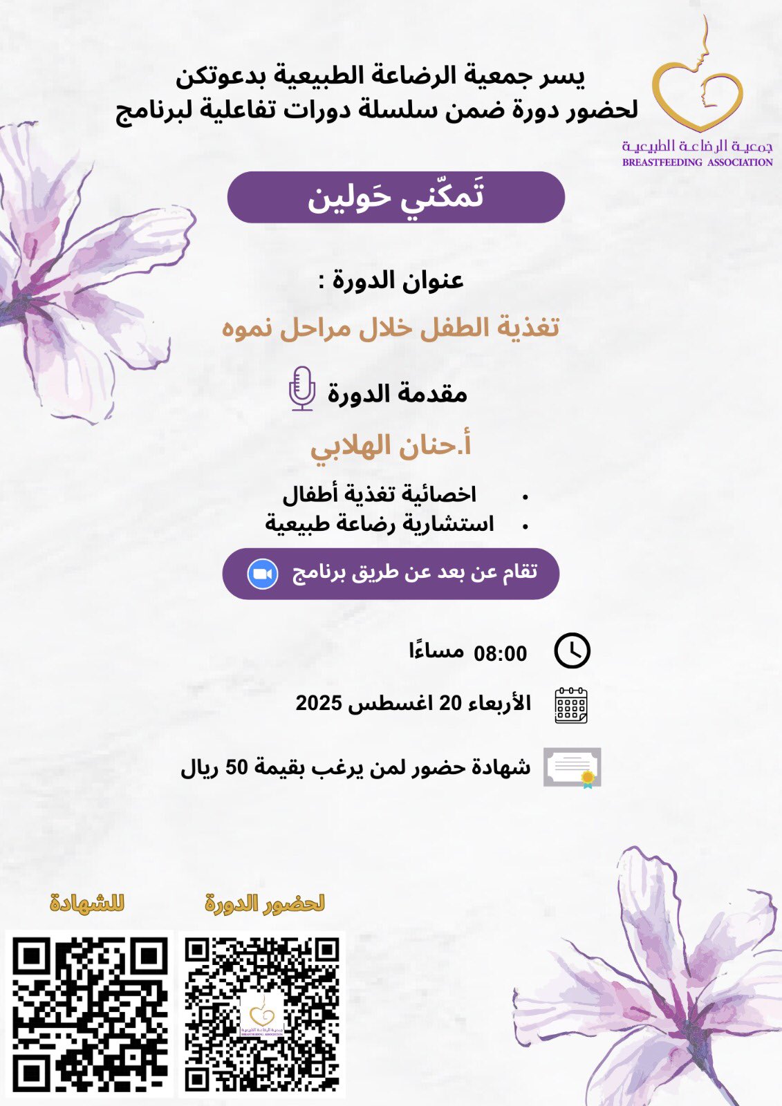جمعية الرضاعة الطبيعية تدعوكم لحضور سلسلة دورات تفاعلية لبرنامج تمكني حولين