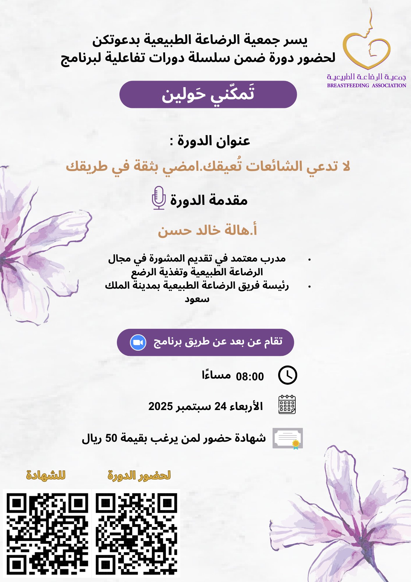 جمعية الرضاعة الطبيعية تدعوكم لحضور سلسلة دورات تفاعلية لبرنامج تمكني حولين