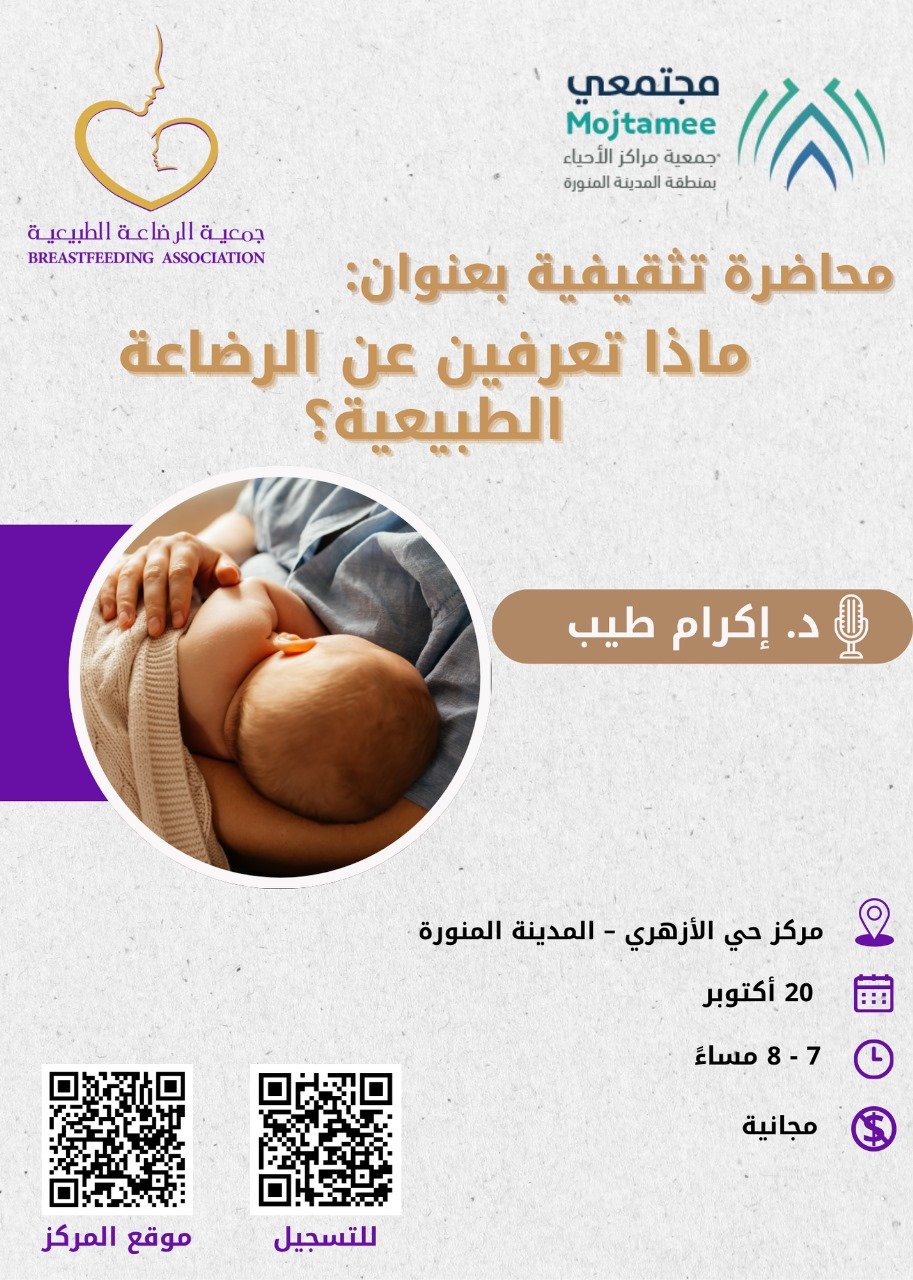 دعوتكم لحضور محاضرة تثقيفية (مجانية) بعنوان: ماذا تعرفين عن الرضاعة الطبيعية؟، وذلك ضمن مبادرة الشراكة المجتمعية مع مراكز الأحياء.
