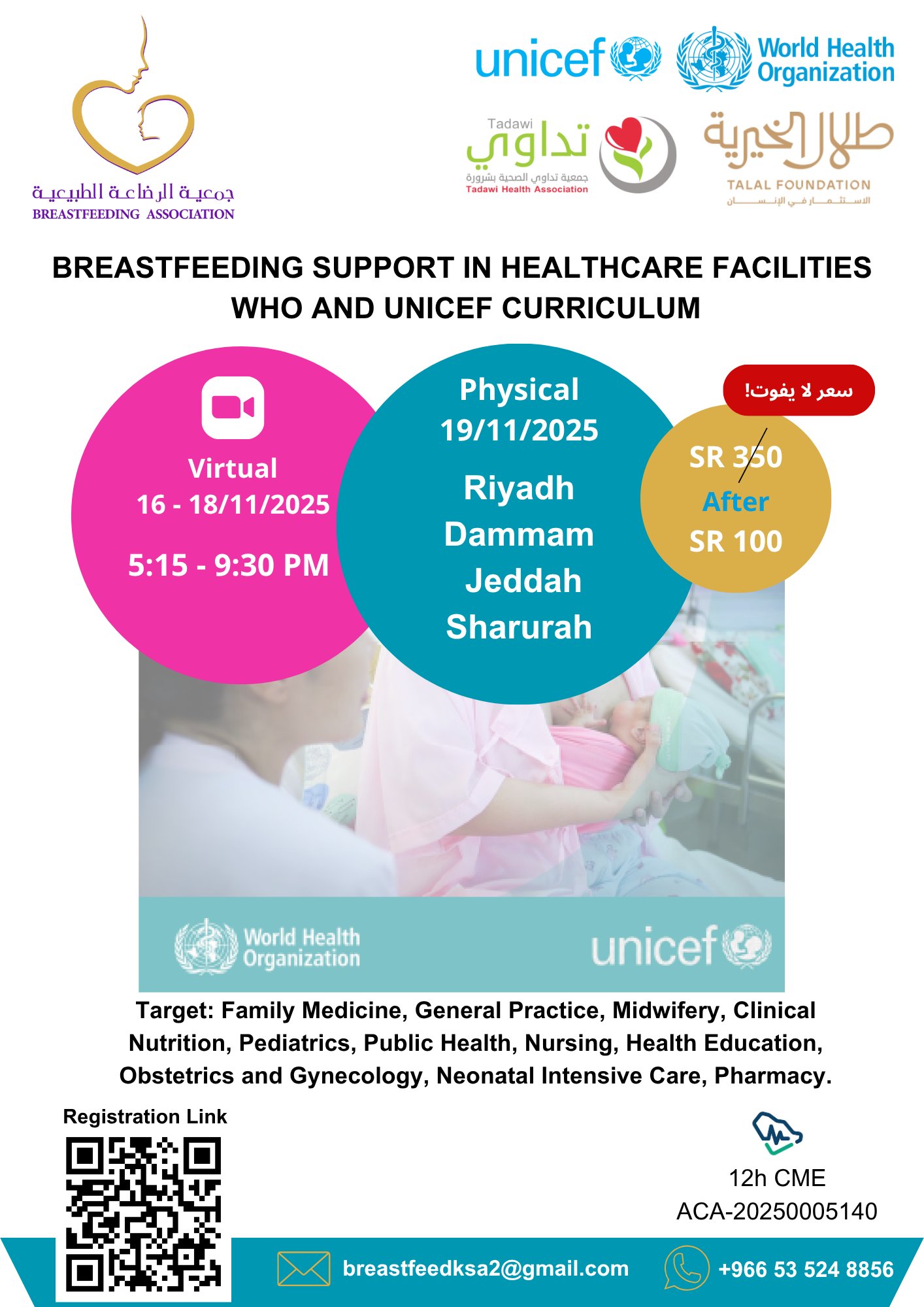 انضم لدورة دعم الرضاعة الطبيعية في المنشآت الصحية المعتمدة على منهج منظمة الصحة العالمية واليونيسف
